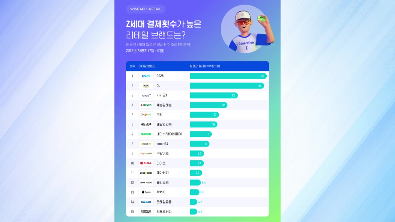 리테일 분석 서비스 와이즈앱·리테일이 지난해 7월부터 12월까지 신용카드와 체크카드 결제 데이터를 분석한 결과 Z세대의 월평균 결제 횟수는 GS25가 4천500만 회로 가장 많았습니다.
