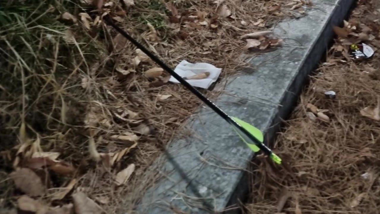 당시 반려견과 산책하던 50대 여성 A 씨는 "이상한 소리가 나서 봤더니 화단에 화살이 꽂혀 있었다"며 경찰에 신고했습니다.