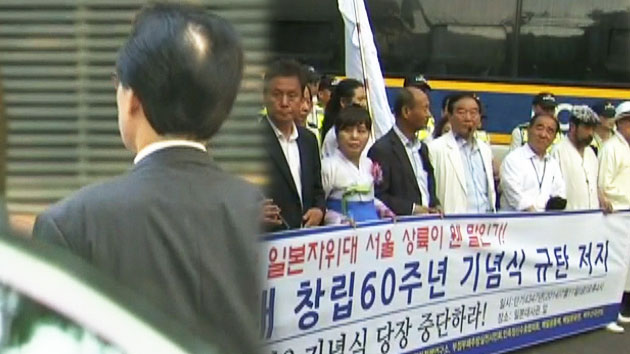 하지만 시민단체들은 일본이 헌법해석을 수정해 집단자위권 행사를 허용한 데 이어 서울에서 자위대 기념식까지 열자 거세게 항의했습니다.