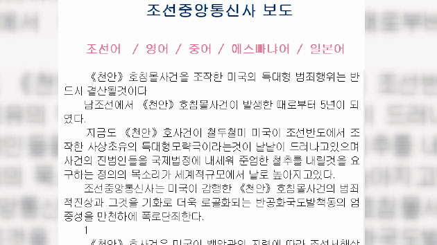 보도는 천안함 사건 이후 대북 제재 강화, 전시작전통제권 전환 연기 등이 착착 진행됐다며 미국은 천안호 사건을 통해 남조선을 세계제패전략 실현의 주요 구성 부분으로 더욱 확고히 장악했다고 비난했습니다.