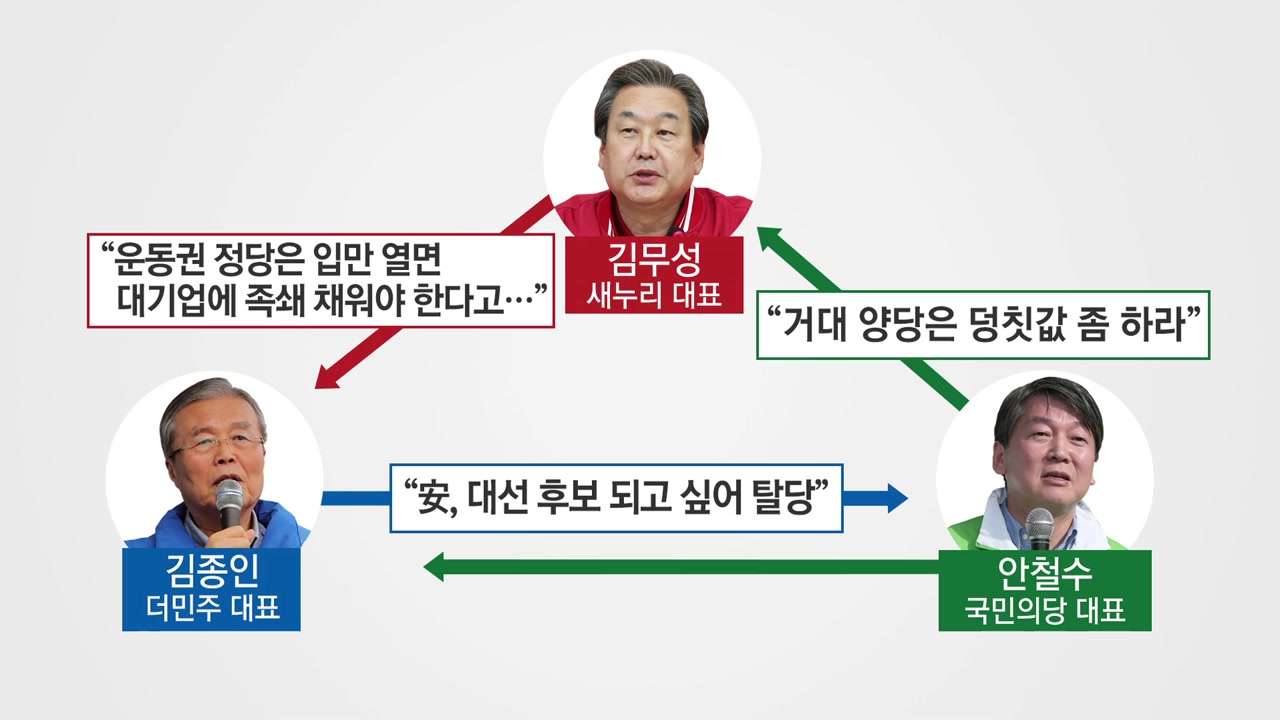 더불어민주당 김종인 대표는 안철수 대표를 향해서 이런 말을 했습니다. 안철수 대표는 대선후보되고 싶어서 탈당했다, 이렇게 비판을 했습니다. 또 국민의당 안철수 대표는 여야 모두에게 거대 양당은 덩칫값 좀 해라, 이렇게 싸잡아 비난을 했습니다.