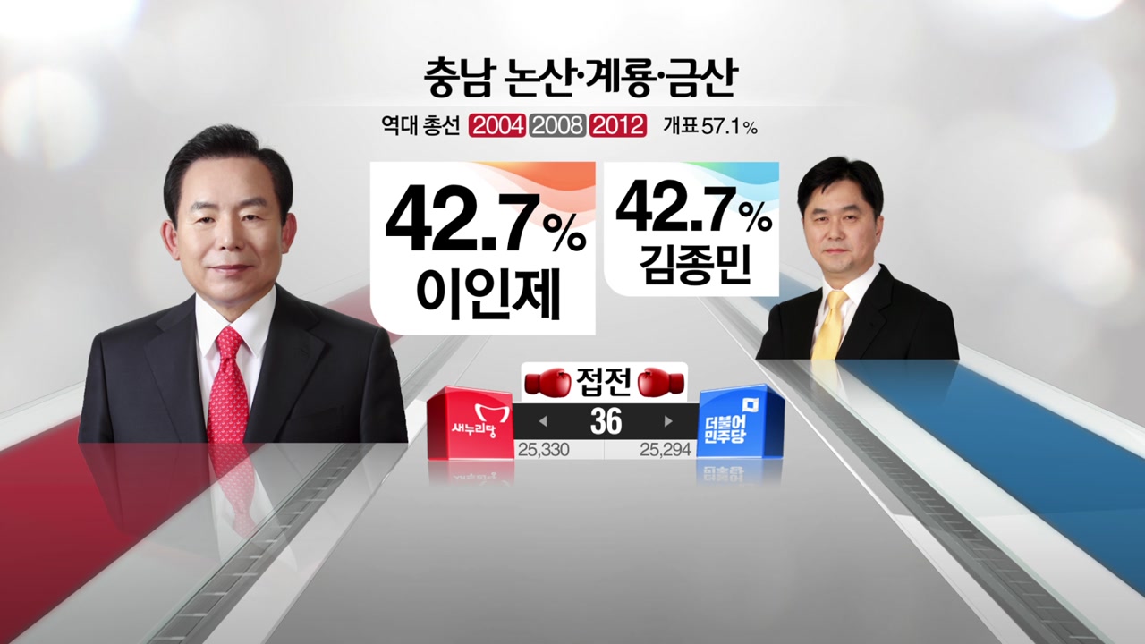 이인제(새) 42.7% 김종민(더) 42.7% 36표 차 초접전