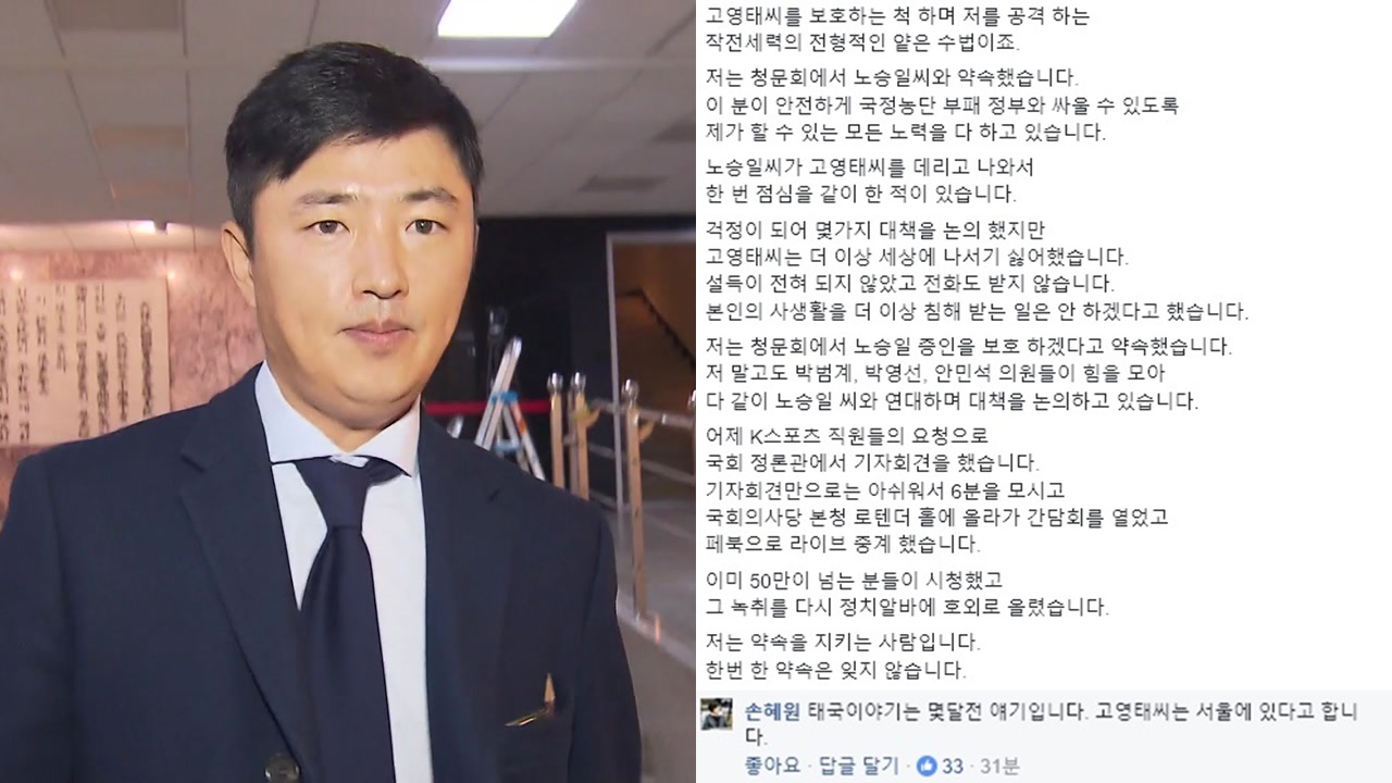 이어 "청문회에서 노승일 증인을 보호 하겠다고 약속했다. 저 말고도 박범계, 박영선, 안민석 의원들이 힘을 모아 다 같이 노승일 씨와 연대하며 대책을 논의하고 있다"며 현재 상황을 덧붙였다.