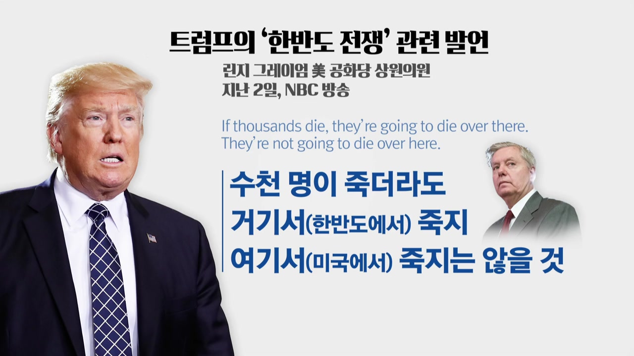 만일 북한 김정은을 저지하기 위해 전쟁이 일어나더라도 한반도에서 일어나는 것이고, 수천 명이 죽더라도 거기서 죽지 미국에서 죽지는 않을 것이라고 자신 앞에서 얘기했다는 겁니다.