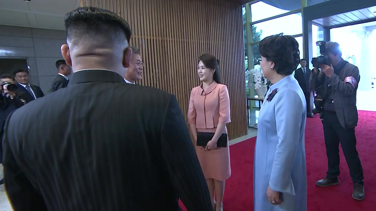 일단 만찬 행사는 비공개로 진행될 예정입니다. 조금 전에 리설주 여사가 평화의 집 앞에 도착하는 모습이 다시 나오고 있습니다. 김정숙 여사가 직접 먼저 와서 대기하고 있다가 영접하는 모습이고요. 이어서 문재인 대통령과 김정은 위원장이 두 여사를 맞이하는 모습입니다.