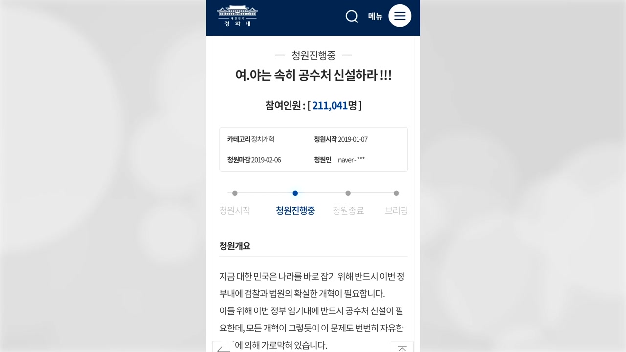 청와대 국민청원 게시판을 보면 ‘여야는 속히 공수처를 설치하라'는 제목으로 게시된 청원에 어제 20만 명 이상이 참여했고 오늘(16일)은 21만 명을 넘었습니다.