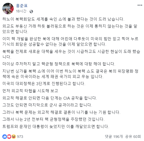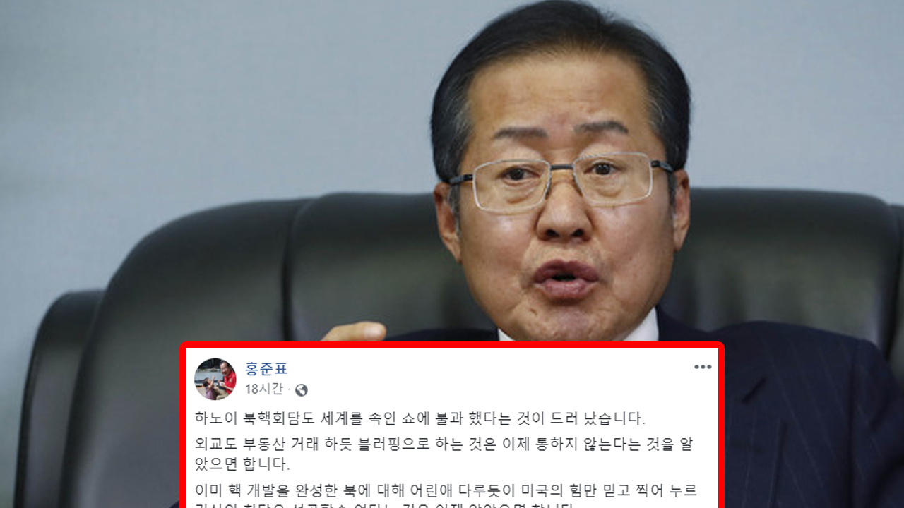 지난 28일 홍 전 대표는 자신의 페이스북을 통해 "하노이 북핵 회담도 세계를 속인 쇼에 불과했다는 것이 드러났다"라며 "외교도 부동산 거래하듯 블러핑으로 하는 것은 이제 통하지 않는다는 것을 알았으면 한다"고 말했다.