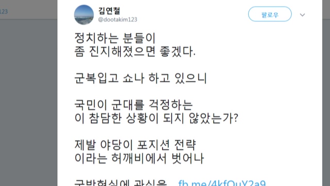 김 후보자는 지난 2015년 3월, 당시 야당 대표였던 문재인 대통령이 천안함 폭침 5주기를 맞아 군복을 입고 해병대를 방문한 것과 관련해 자신의 SNS에 군복을 입고 쇼를 하고 있다는 내용의 글을 올렸습니다.