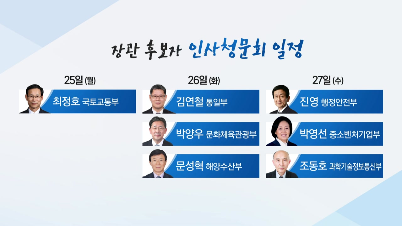 국토교통부 최정호 장관 후보자를 시작으로, 이튿날 통일부 김연철, 문화체육관광부 박양우, 해양수산부 문성혁 후보자, 마지막 날인 수요일에는 현직 의원으로 특히 관심이 많은 행정안전부 진영, 중소벤처기업부 박영선 후보자와 과학기술정보통신부 조동호 장관 후보자가 검증대에 오릅니다.