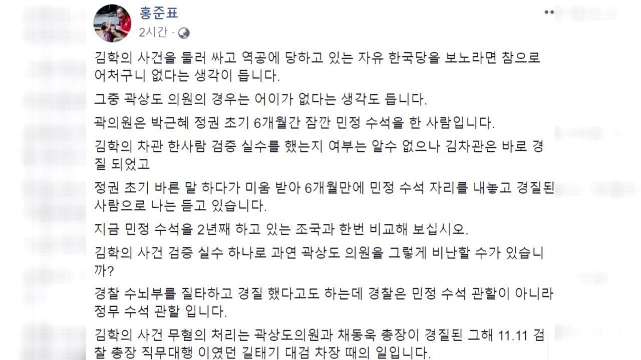 홍 전 대표는 자신의 페이스북에서 김학의 사건을 둘러싸고 역공에 당하고 있는 한국당을 보면 어처구니가 없고, 곽 의원의 경우는 어이가 없다는 생각도 든다면서 이같이 밝혔습니다.