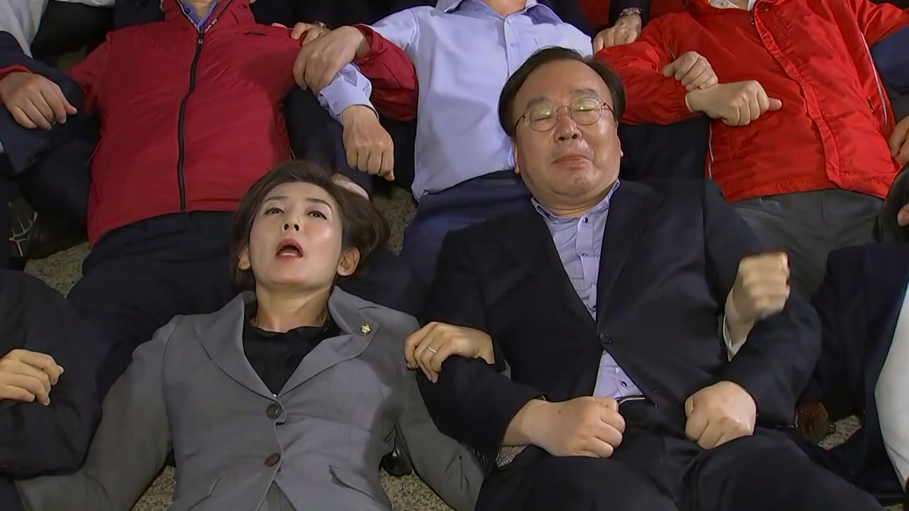 두 회의장에 나뉘어 포진한 한국당 의원들은 문 앞에 드러눕거나 길을 막아서며 실력 저지에 나섰고,