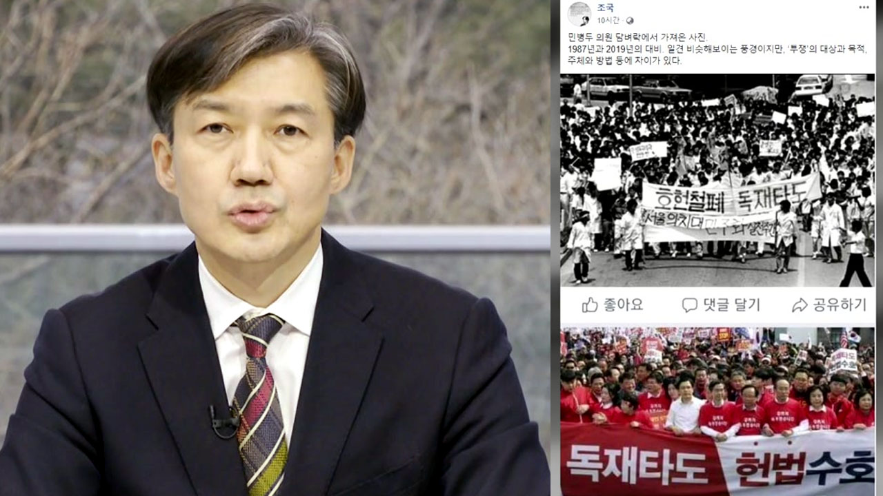 조국 청와대 민정수석은 이 사진과 최근 자유한국당 의원들의 장외집회 사진을 나란히 SNS에 게시했습니다.