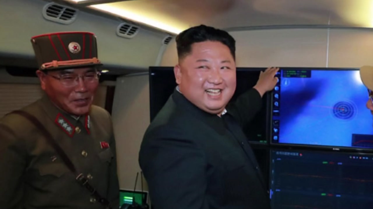 [조선중앙TV : 김정은 동지께서 8월 2일 새벽 새로 개발한 대구경 조종 방사포의 시험사격을 또다시 지도하셨습니다.]
