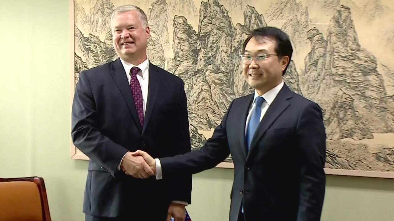 비건 대표는 조금 전 이곳 통일부를 방문해 김연철 통일부 장관을 예방하고 최근 한반도 정세에 대해 의견을 나누고 있습니다.