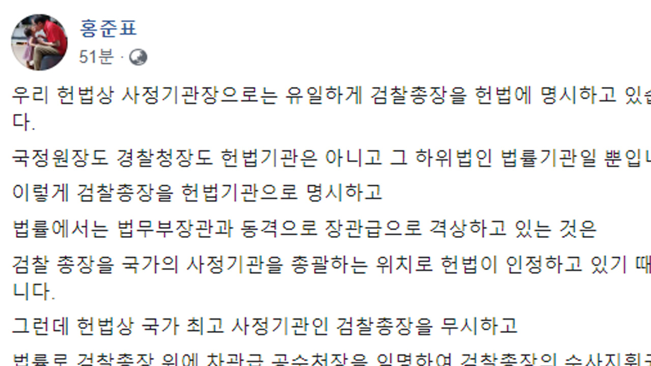 27일 홍 전 대표는 "우리 헌법상 사정기관장으로는 유일하게 검찰총장을 헌법에 명시하고 있다"라며 "국정원장도 경찰청장도 헌법기관은 아니고 그 하위법인 법률기관일 뿐이다"고 말했다.