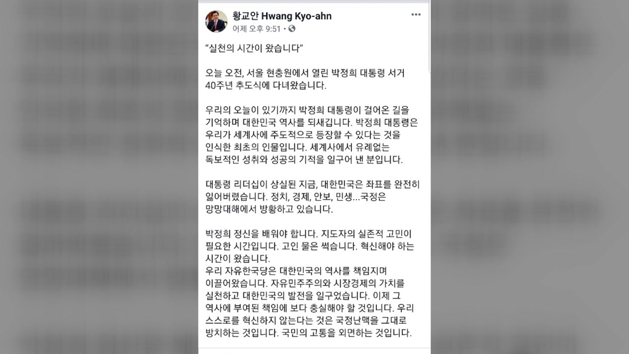 황 대표는 오늘 자신의 SNS를 통해 박정희 전 대통령은 세계사에서 유례없는 독보적인 성취와 성공의 기적을 일구어낸 분이라며 이같이 주장했습니다.