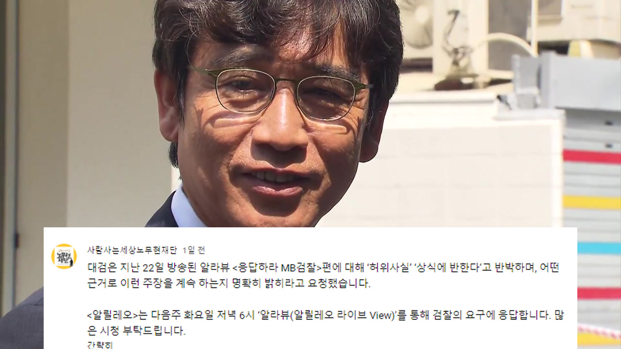 26일 유 이사장 측은 유튜브 채널'사람사는세상 노무현재단' 커뮤니티 공지를 통해 "대검은 지난 22일 방송된 '응답하라 MB 검찰' 편에 대해 '허위사실', '상식에 반한다'고 반박하며 어떤 근거로 이런 주장을 계속하는지 명확히 밝히라고 요청했다"라며 "다음 주 화요일(29일) 라이브 방송을 통해 검찰의 요구에 응답한다"고 말했다.
