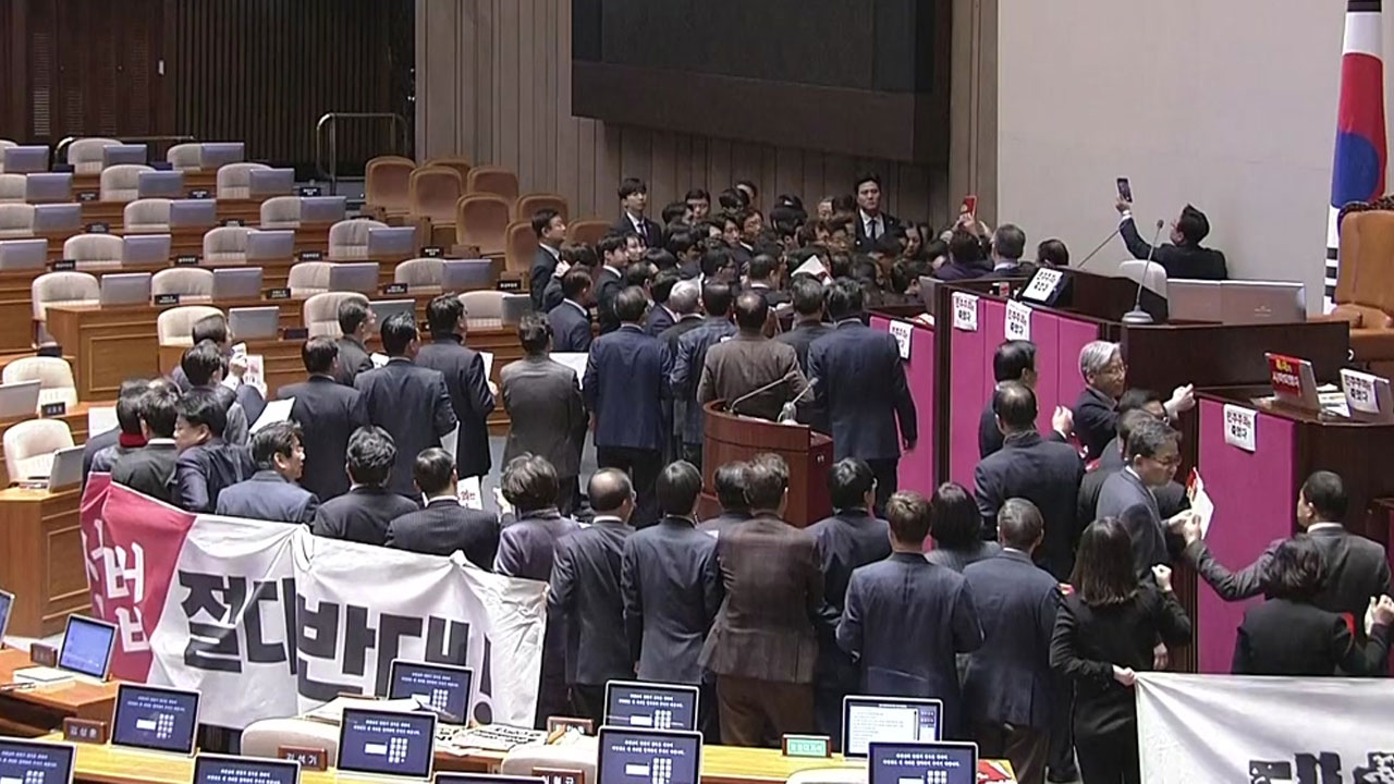 일단은 오늘 아무래도 본회의가 열리게 되면 선거법 개정안 처리가 가장 우선 순위로 지금 되어 있기 때문에 한국당에서는 선거법 처리만은 반드시 막아야 한다는 입장이라서 지금 현재 화면으로 보시다시피 의장석으로 문희상 국회의장이 오르지 못하도록 막교있습니다.