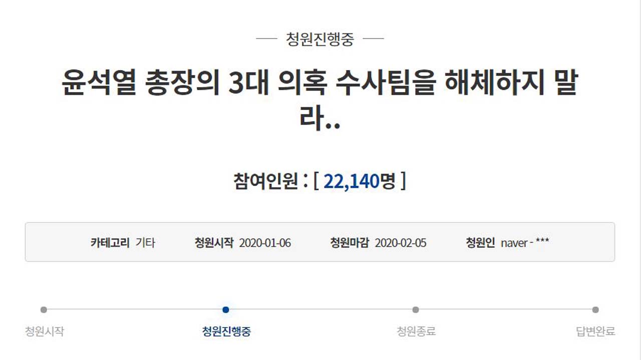 지난 6일 청와대 국민청원 게시판에는 '윤석열 총장의 3대 의혹 수사팀을 해체하지 말라'는 제목의 글이 올라왔다. 이 청원은 10일 오후 2시 30분 기준 2만 2천여 명이 동의했다.