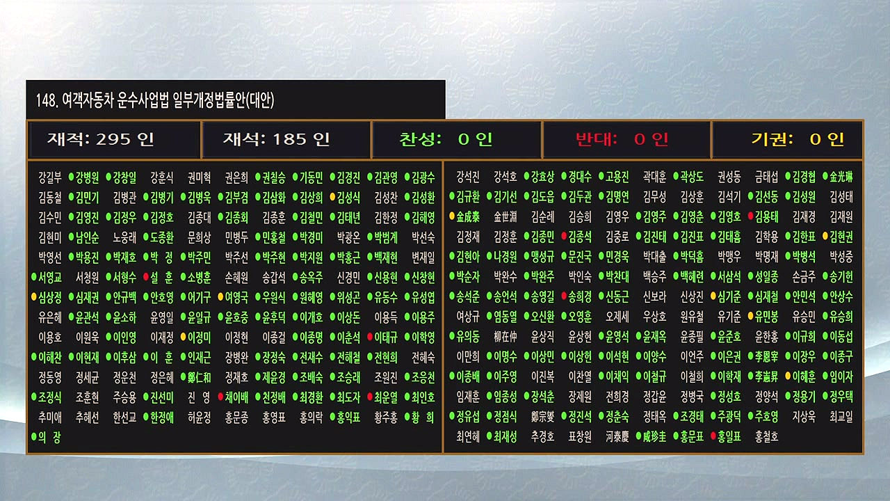 국회는 어제(6일) 본회의를 열고 재석 185인, 찬성 168인, 반대 8인, 기권 9인으로 여객자동차운수사업법 개정안을 가결시켰습니다.