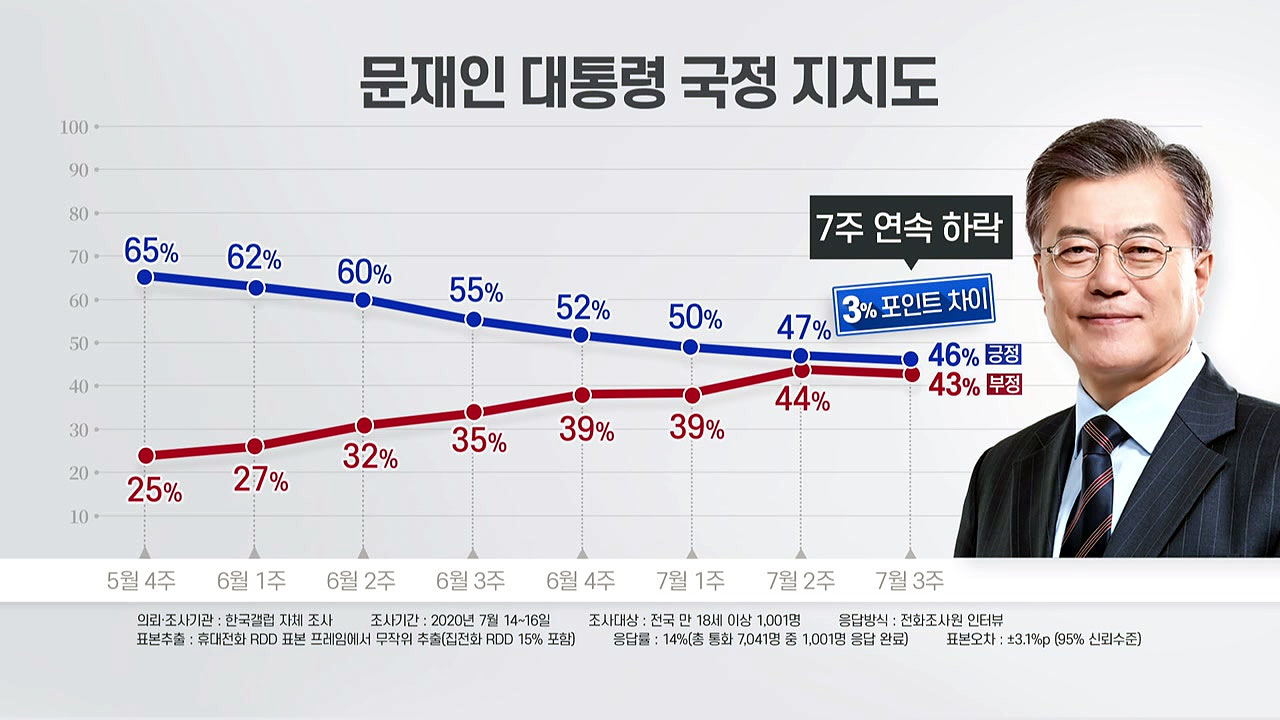 문재인 대통령의 국정 지지율이 지난주 7주 연속 하락하면서 40% 중반까지 내려갔습니다.