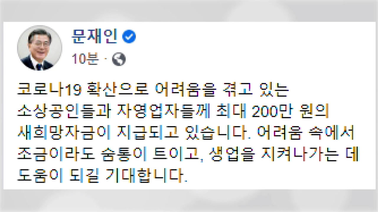 문 대통령은 SNS에 올린 글에서 관계부처의 적극 행정과 협업을 통해 어제까지는 약 200만 명의 소상공인과 자영업자에게 새희망자금 지급이 완료됐다며 이같이 말했습니다.