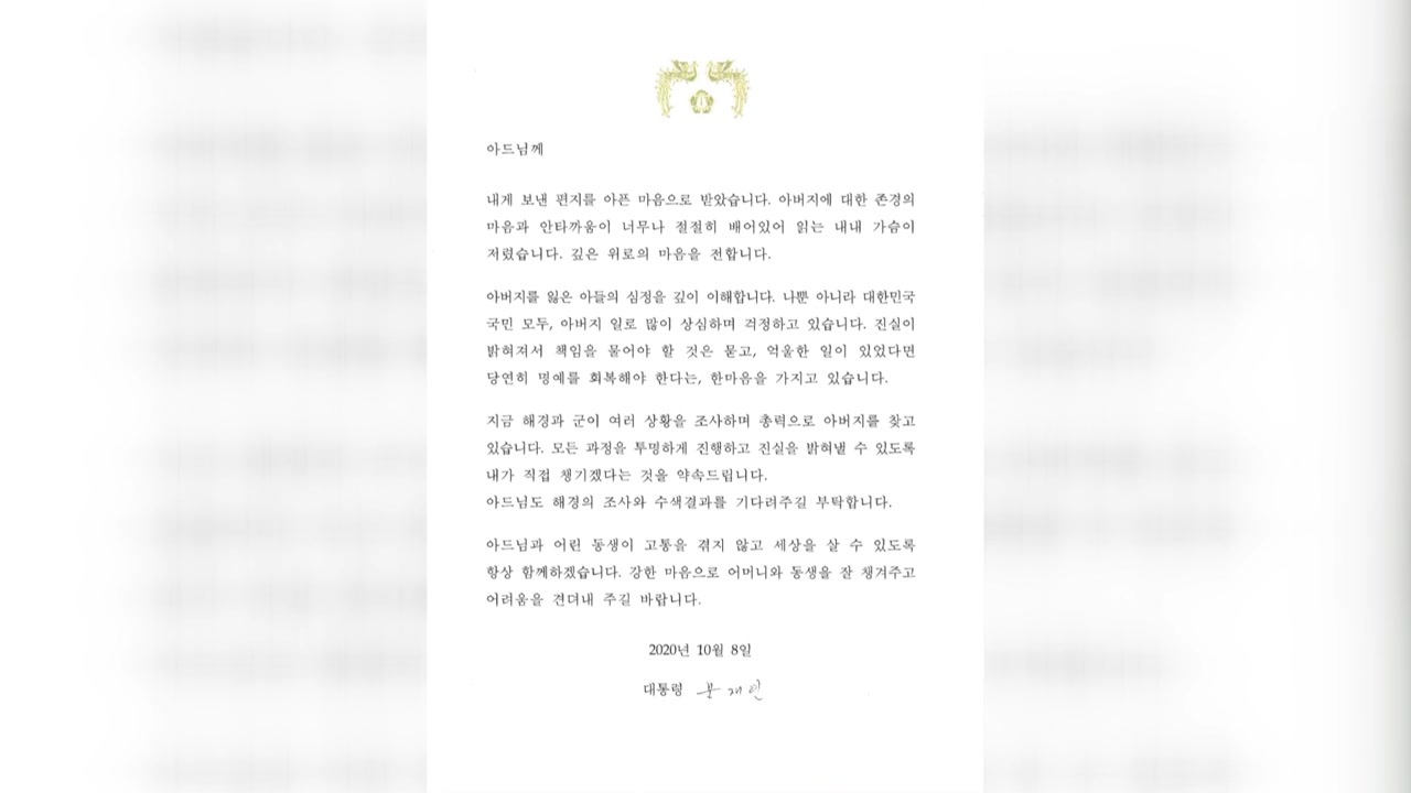 문재인 대통령이 피격 공무원 아들에게 보낸 답장을 친필로 보내지 않아 진정성이 없다는 일부의 주장에 대해 청와대는 문 대통령의 서한은 대통령이 직접 육필로 작성해 비서진의 타이핑 작업과 전자 서명 과정을 거친다고 설명했습니다.