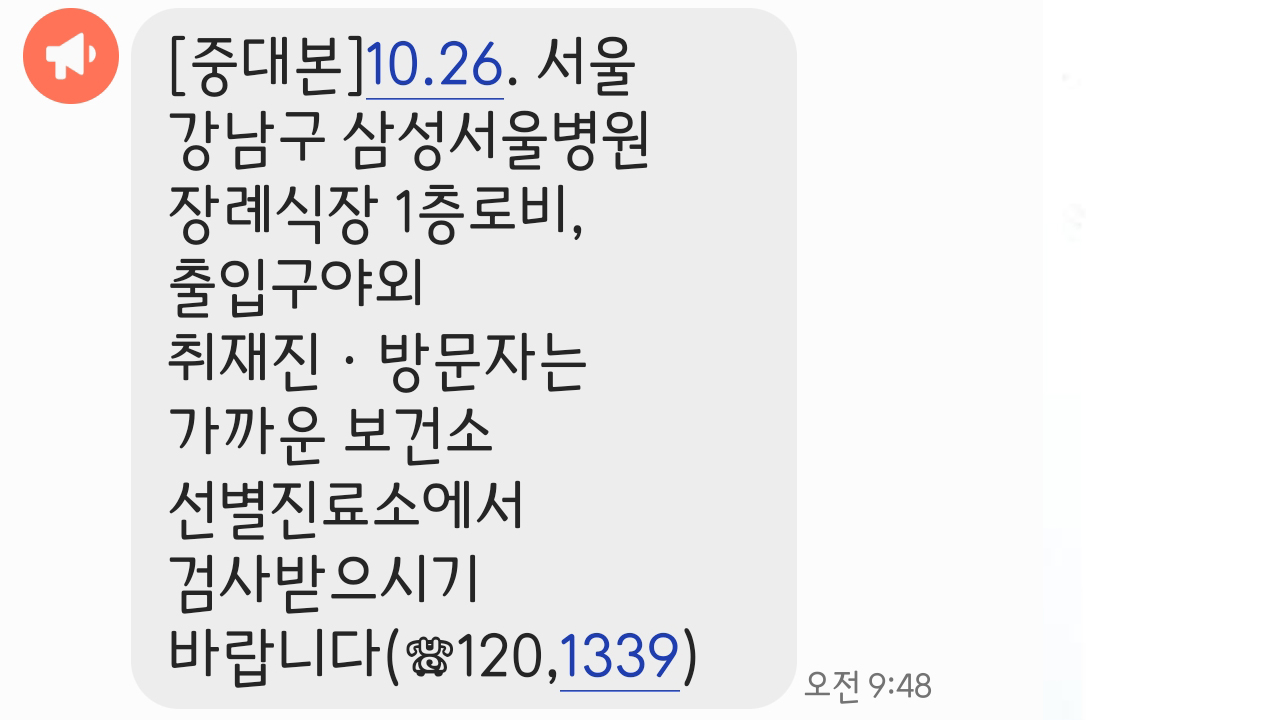 4일 오전 9시 50분쯤 중앙재난안전대책본부는 긴급재난문자를 보내 "10월 26일 서울 강남구 삼성서울병원 장례식장 1층 로비, 출입구 야외 취재진·방문자는 가까운 선별 진료소에서 검사받으시기 바랍니다"라고 공지했다.