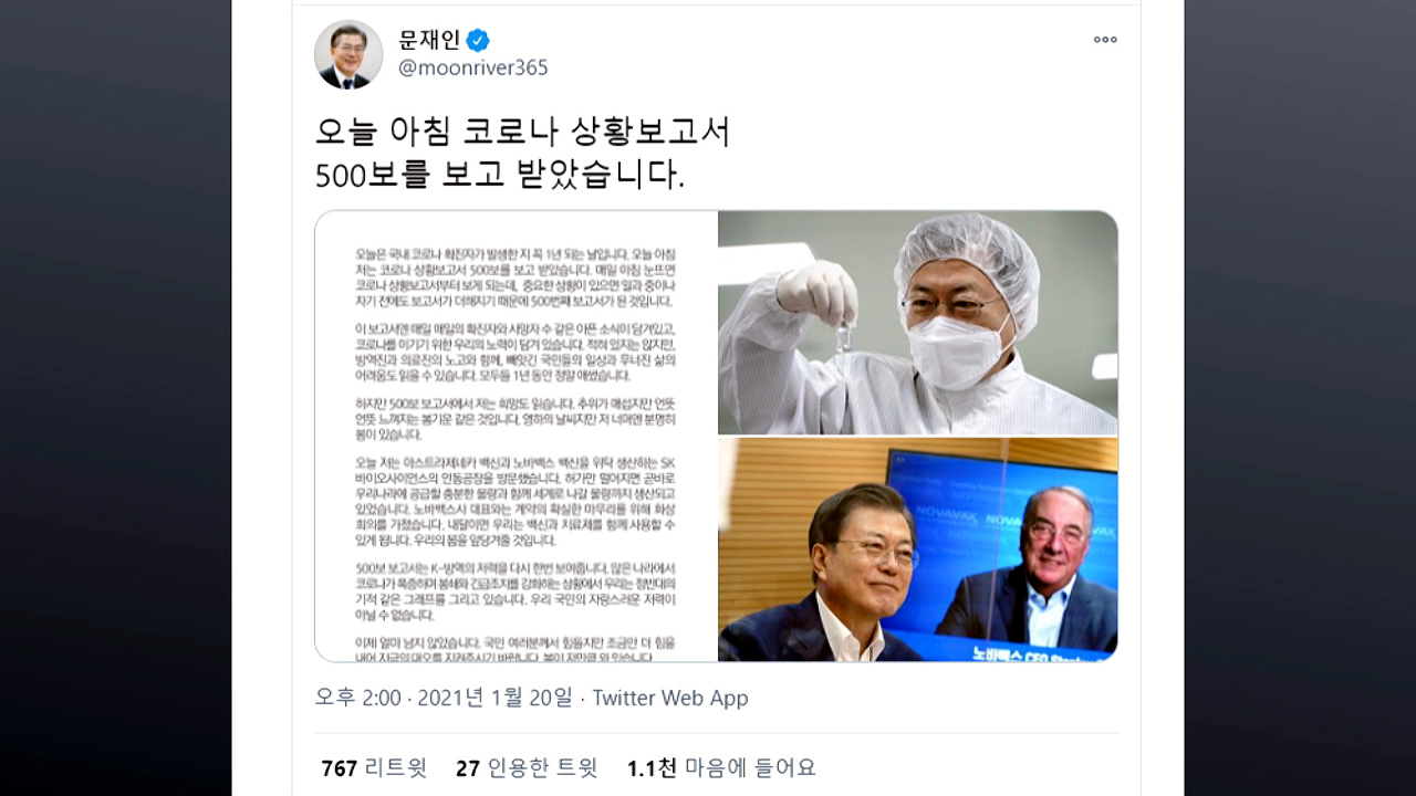문재인 대통령이 국내 코로나 확진자 발생 이후 1년 동안 500보의 코로나 상황 보고서를 받으며, 국민의 무너진 삶과 동시에 희망도 읽었다면서, 머지않아 봄이 올 것이라고 강조했습니다.