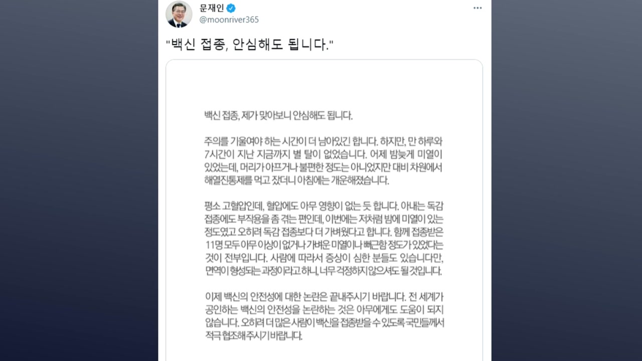 문 대통령은 백신 접종 하루가 지난 오늘 SNS에 올린 글에서 주의를 기울여야 하는 시간이 더 남아있긴 하지만, 지금까지 별 탈이 없다며 이 같이 말했습니다.