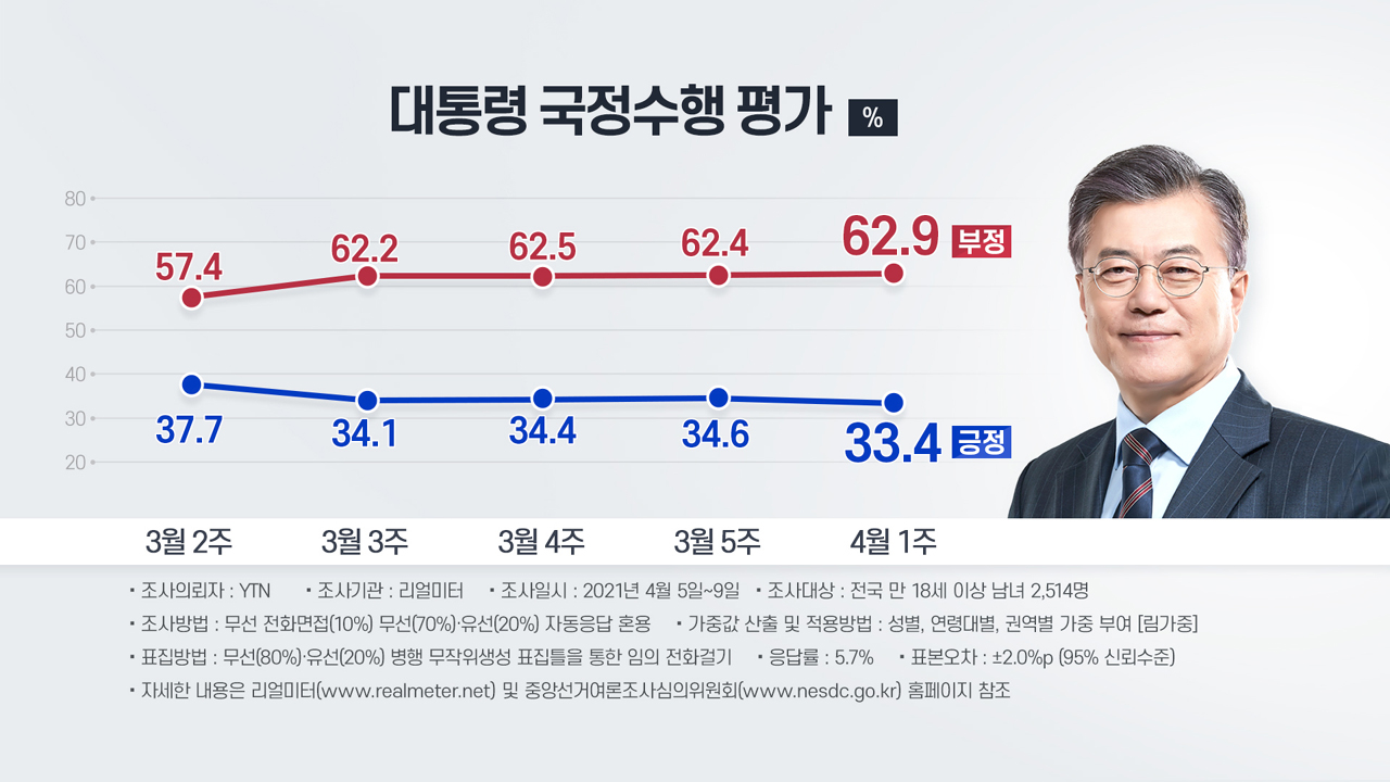 YTN이 리얼미터에 의뢰해 실시한 4월 1주차 주간집계 결과를 보면, 문 대통령 국정 수행에 대한 긍정 평가는 전주보다 1.2% 포인트 떨어진 33.4%로 집권 이후 가장 낮았습니다.