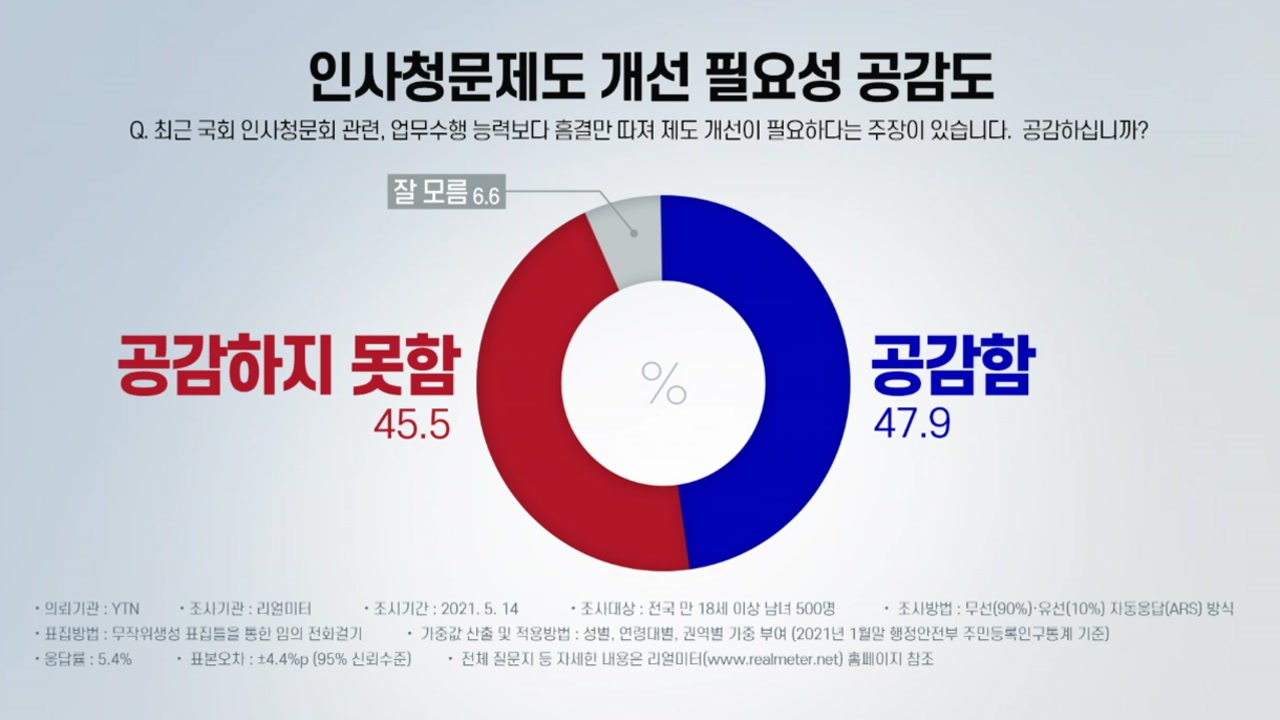 최근 인사청문회 관련해서 업무수행 능력보다는 후보자 개인 혹은 가족들의 흠결만 따지는 이런 문제에 대해서 제도 개선이 필요하다는 주장이 나오고 있습니다. 그래서 YTN 의뢰로 리얼미터가 지난주에 긴급 여론조사를 했는데요. 제도 개선에 대해서 공감한다는 의견이 47.9%, 공감하지 못한다는 의견이 45.5%로 오차범위 내에서 팽팽하게 나타났습니다.