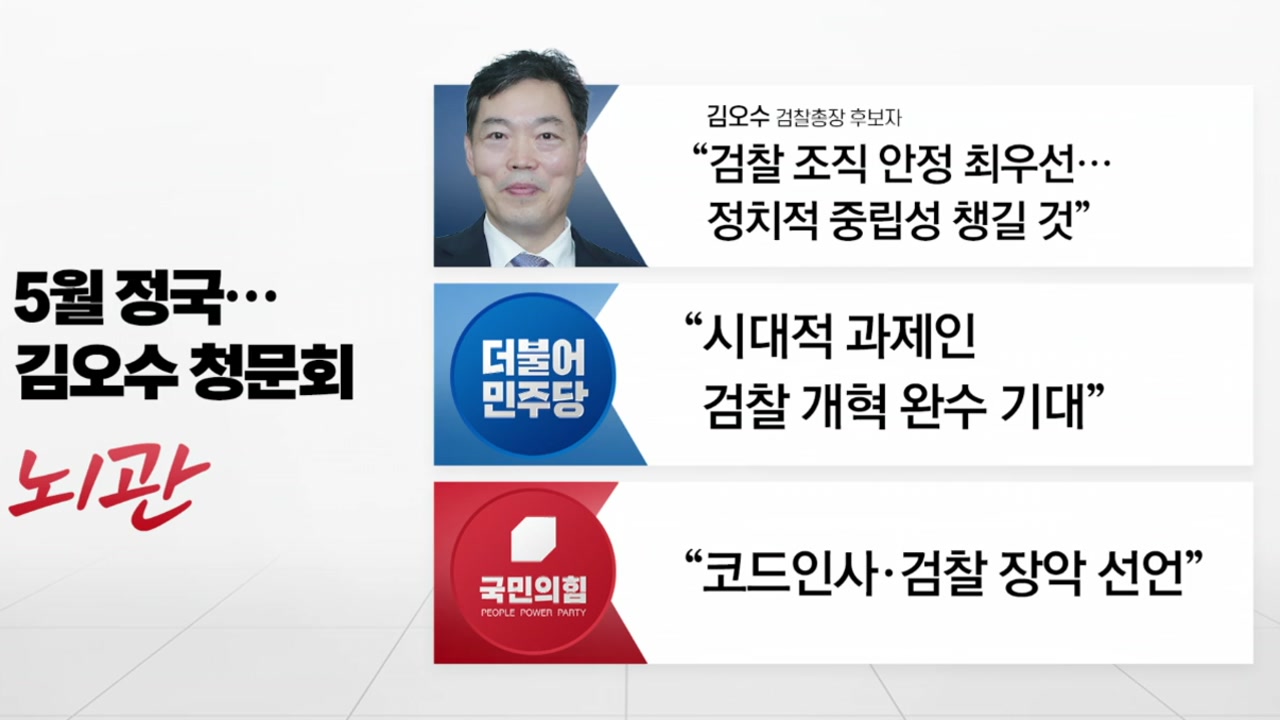 야당 측에서는 김오수 후보자 임명, 내정이 발표될 때부터 부적격 인사다, 이렇게 규정했어요. 무슨 개인적인 문제, 도덕성 문제 이런 사유는 아니고요. 그동안 법무부 차관을 오래 했잖아요. 그러다 보니까 소위 문재인 정부의 검찰개혁에 힘을 실은 사람이고 그리고 무엇보다도 야당 쪽 입장에서 볼 때는 예를 들어 조국 장관 사태가 났을 때도 뭔가 검찰과의 그런 과정에서 정권편을 든다. 이런 이야기들이 들려왔었고 무엇보다 김학의 출금 사건과 관련돼서 조사를 받은 부분들. 이런 것 때문에 뭐랄까요. 청와대나 여당 편을 드는 그런 검찰총장 아니냐. 이 부분을 부각하고 있는 것 같아요. 거기에 대해서 여당 측에서는 일단 김학의 출금 사건 이거에 대해서 굉장히 엄호를 아주 강력하게 하면서 검찰이 너무 무리한 수사를 하는 거 아니냐 이러면서 김오수 후보자를 방어하는 데 집중할 것으로 보이기 때문에 개인적인 갈등보다는 검찰개혁의 성격 그리고 그 속에서의 김오수 후보자의 역할. 이런 부분들이 상세하게 몇월 며칠날 뭐 했죠, 뭐 했죠? 이런 것들을 가지고 둘러싼 논쟁이 아마도 치열하게 펼쳐지지 않을까 싶습니다.