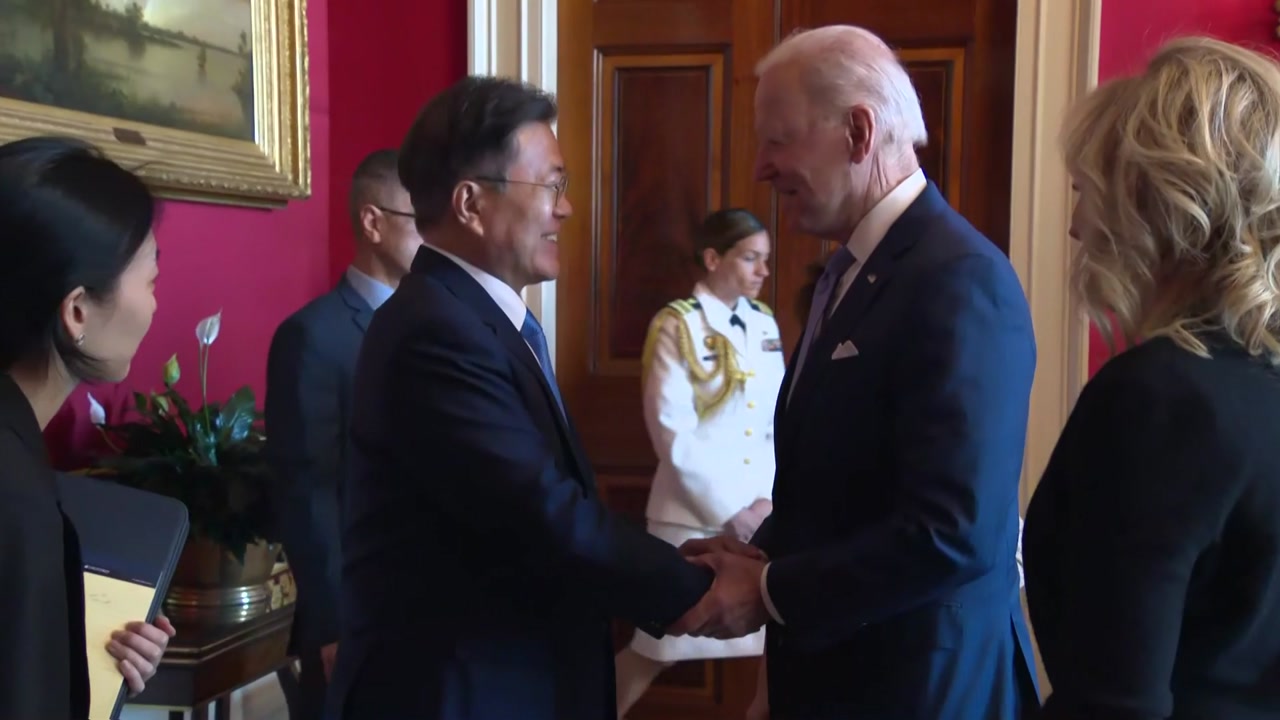 이 자리에서 문 대통령은 처음으로 마스크를 쓰지 않고 회담을 갖게 된 것은 기쁜 일이라고 말했고, 바이든 대통령도 동질감을 느낀다고 화답했다고 설명했습니다.