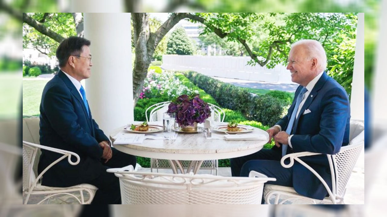 문재인 대통령과 조 바이든 미국 대통령이 백악관에서 마스크를 벗은 채 단독 회동을 가졌습니다.