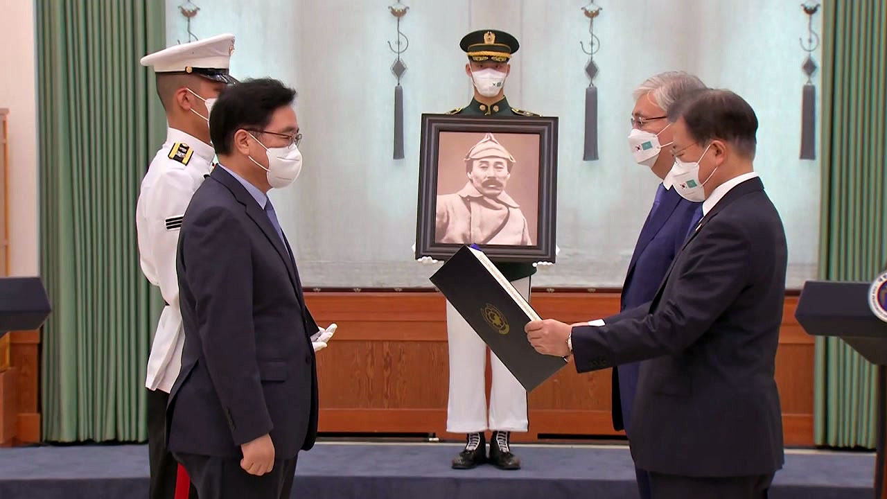 문 대통령은 조금 전, 카심-조마르트 토카예프 카자흐스탄 대통령이 참석한 가운데, 홍범도장군기념사업회 우원식 이사장에게 훈장을 직접 수여했습니다.