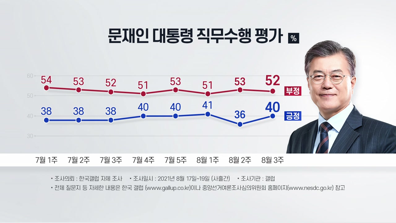 여론조사 기관 한국 갤럽이 전국 만 18세 이상 남녀 1,001명을 대상으로 문 대통령의 직무 수행 평가를 조사한 결과 긍정평가가 전주보다 4%p 상승한 40%로 나타났습니다.