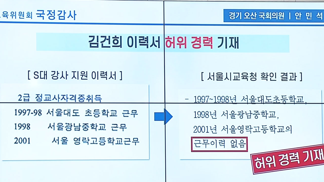 국회 교육위원회 소속 안민석 의원은 서울교육청으로부터 제출받은 자료를 확인한 결과 김 씨는 지난 1997년부터 2년 동안 서울 대도초등학교와 1998년 서울 광남중학교, 2001년 서울 영락고등학교의 근무 이력이 없었다고 밝혔습니다.