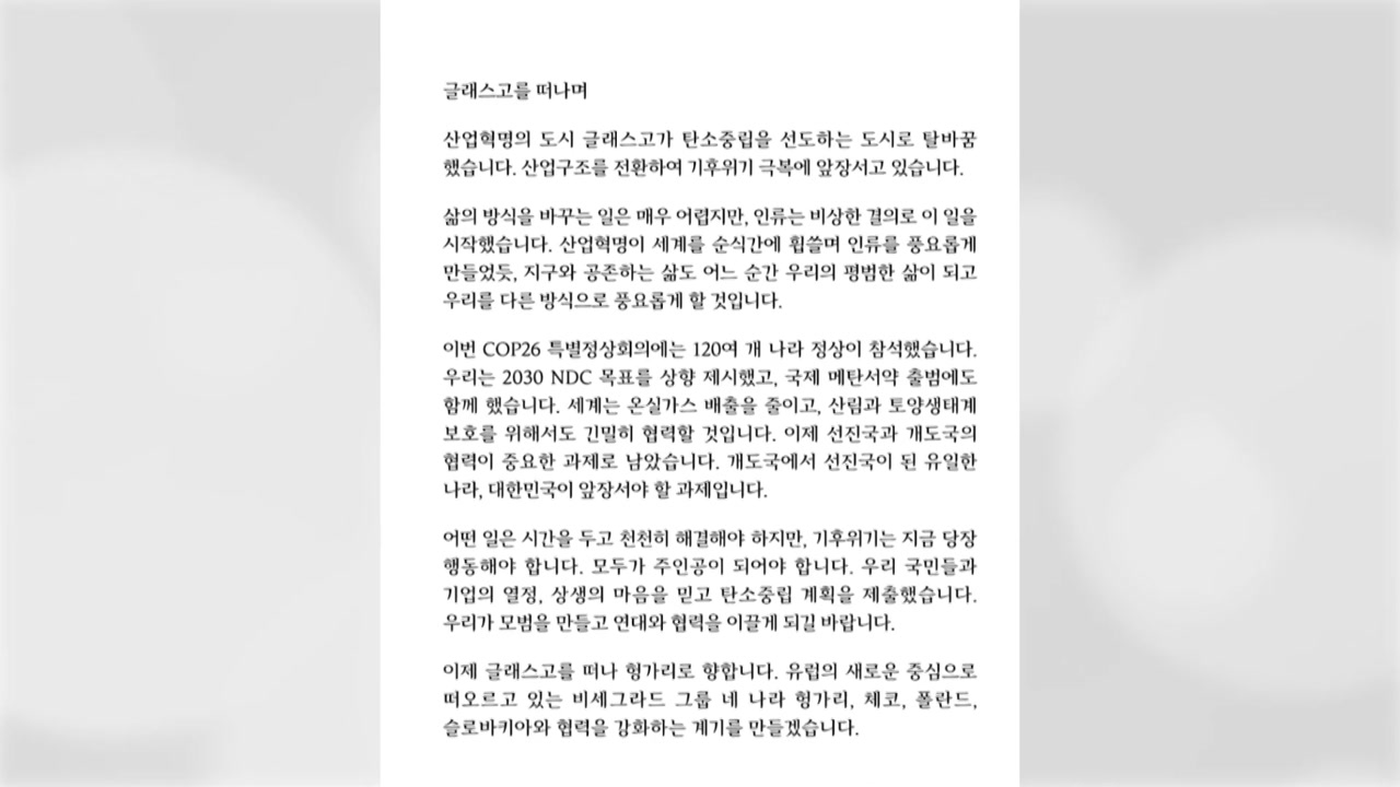 유럽을 순방 중인 문 대통령은 현지 시간 2일 오후 영국 글래스고를 떠나며 SNS에 올린 글에서, 기후위기 문제는 이제 선진국과 개도국의 협력이 중요한 과제라며 이같이 적었습니다.
