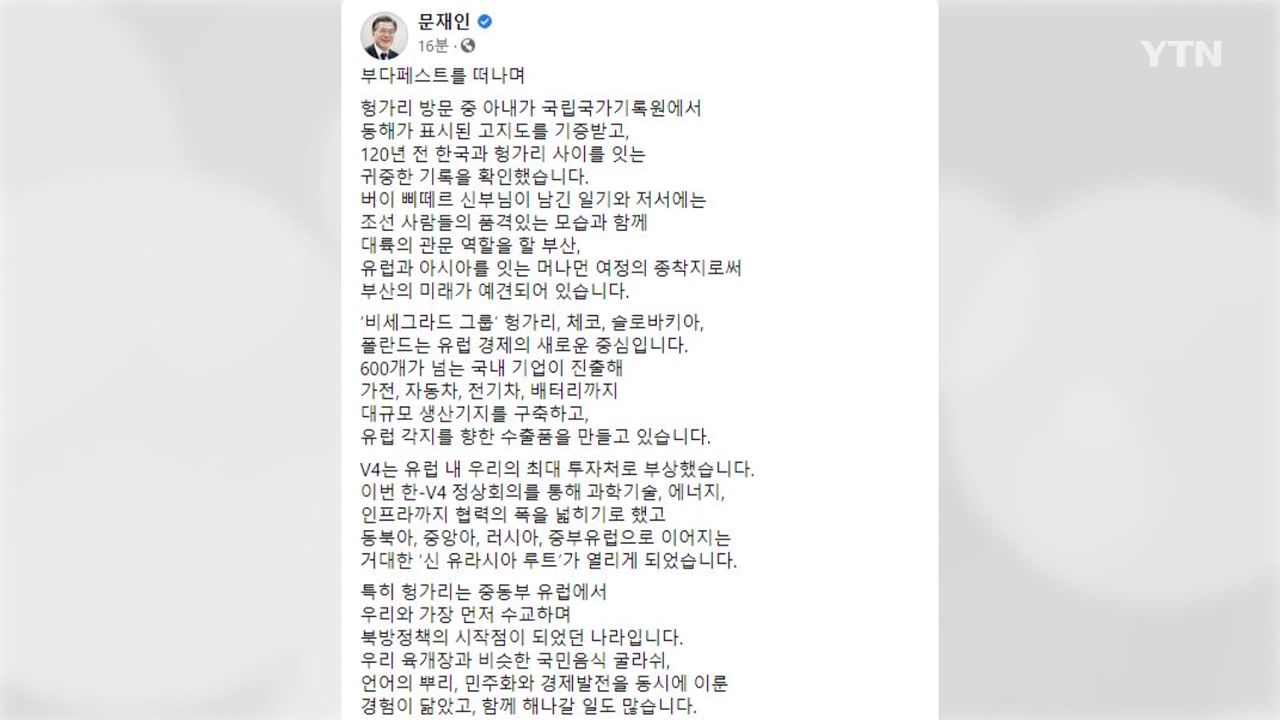 문 대통령은 7박 9일 유럽 일정의 마지막 순방지인 헝가리 부다페스트를 떠나기에 앞서 SNS에 올린 글에서 V4는 유럽 내 우리의 최대 투자처로 부상했다며 이같이 밝혔습니다.
