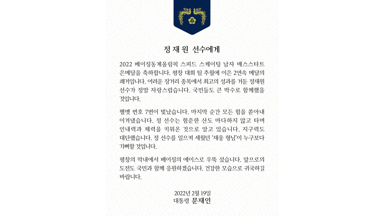 문재인 대통령은 베이징동계올림픽 스피드스케이팅 남자 매스스타트에서 메달을 딴 정재원과 이승훈 선수에게 각각 축전을 보내 축하했습니다.