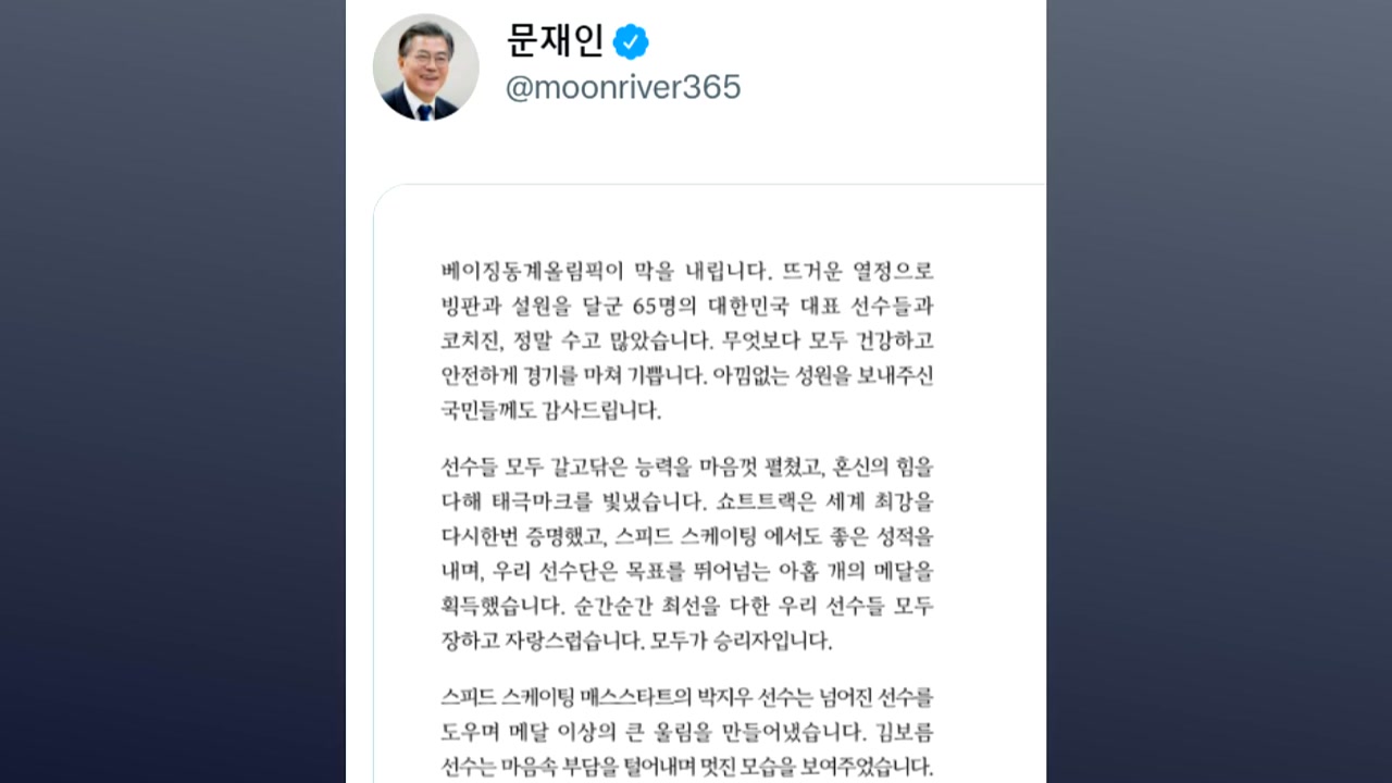 문 대통령은 베이징올림픽 폐막에 맞춰 SNS에 올린 글에서 뜨거운 열정으로 빙판과 설원을 달군 65명의 대한민국 대표 선수들과 코치진에게 모두 건강하고 안전하게 경기를 마쳐 기쁘다고 적었습니다.