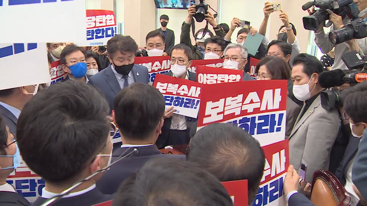 '보복수사'란 손팻말을 든 민주당 의원들은 위원장석을 둘러싼 채 여당의 국감 단독 개시에 거세게 항의했고,