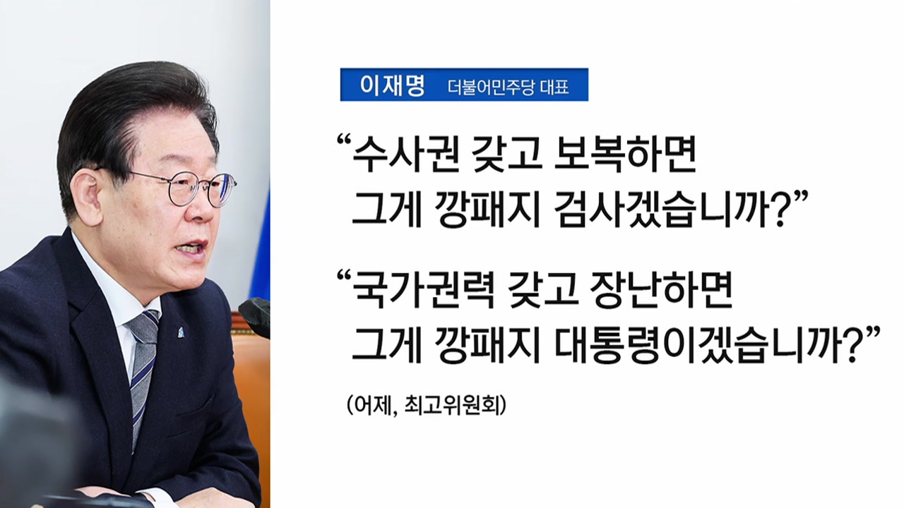 알겠습니다. 여야 입장을 간단히 두 의원께 들어봤고요. 이재명 대표, 어제는 국가 권력 가지고 장난하면 깡패지 대통령이냐면서 발언의 수위를 높이기도 했죠. 오늘 여야 반응 듣고 더 이야기 나누겠습니다.
