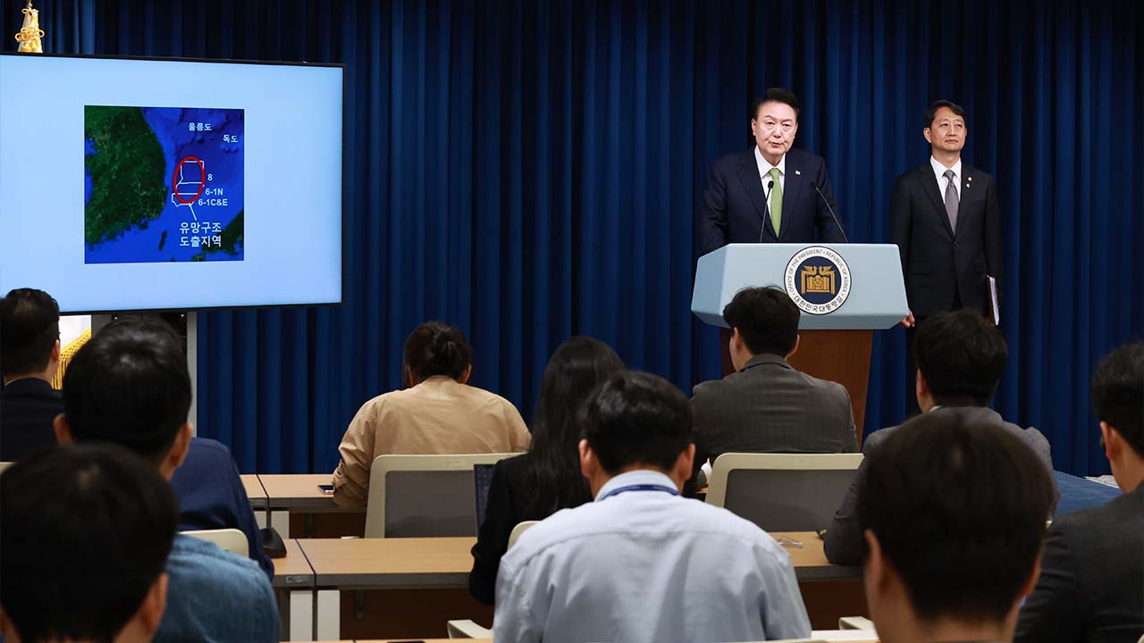 윤석열 대통령이 취임 후 첫 국정 브리핑을 열고 동해에 최대 140억 배럴에 이르는 석유와 가스가 매장돼 있을 가능성이 크다고 발표했습니다.