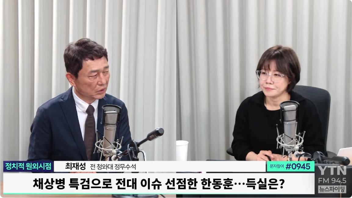 ◇ 최재성 : 저 같으면 그러니까 그런 정무적 기능이라든가 사실 정치 자체가 작동하기 어려운 그런 이제 여권이고 또 대통령실이고 그렇기 때문에 그렇다고 보지만요. 저는 한동훈 위원장의 출마를 어떻게든 막았을 것이다 막았어야 된다. 그리고 그를 위한 아주 그 정치력이 발동이 됐어야 되는데 당에도 그런 것이 없고 대통령실도 사실은 없는 거죠. 그래서 이거는 전쟁적 상황으로 가는 거다 이렇게 제가 이제 진단을 한 거죠.