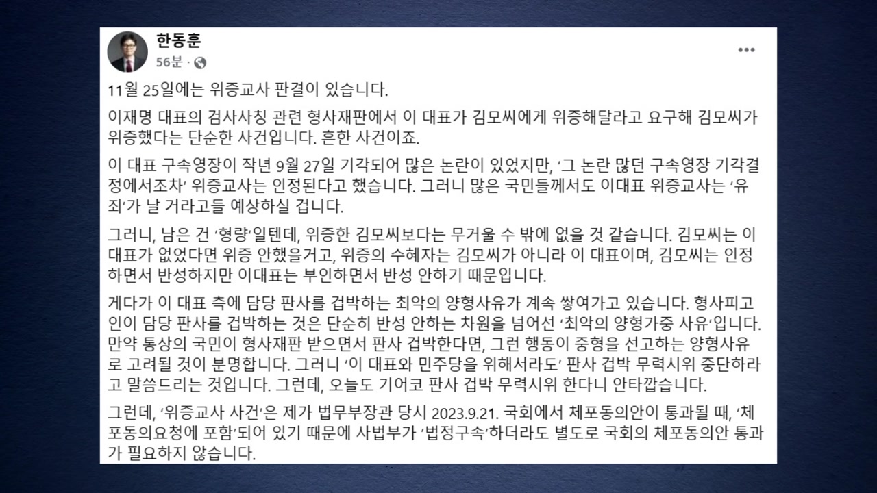 국민의힘 한동훈 대표는 오늘(16일) 더불어민주당이 여는 '정권 규탄 집회'를 '판사 겁박 무력시위'로 규정하며 최악의 양형 가중사유라고 지적했습니다.
