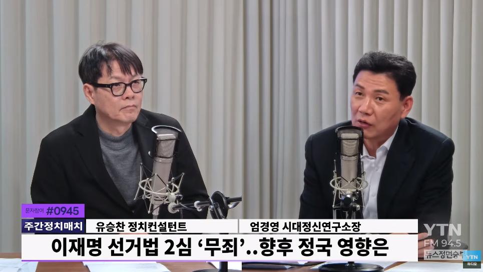 ☆ 유승찬 : 저도 비슷한데요. 저는 그래도 순서를 좀 바꿔서 국민의힘이 멘붕에 빠지지 않았을까. 완벽하게 무죄가 나올 거라고는 예상하지 못했을 것 같아요. 그래서 항소심 유죄가 나오면 그거를 공격의 소재로 삼아서 민주당과 이재명 후보를 압박 대표를 압박하려고 했을 텐데 확 들어온 거잖아요. 그래서 지금 탄핵을 찬성했던 그 친한계 의원들조차도 이거 그냥 이재명 대통령 만들어주는 길 아니냐 이런 우려들이 나오 고 있거든요. 그만큼 일종의 멘붕에 빠졌다 이렇게 보이는데요. 저는 길게 보면 아까도 말씀드렸지만 사실 대선에서 누구를 공격하는 것만으 로 이기는 후보를 본 적이 없습니다. 저는 뭔가 자기 얘기를 하지 않으면, 사실은 자기 얘기를 돋보이게 하지 않으면 대선을 못 이깁니다. 이 번에 어쨌든 트럼프 선거 같은 경우는 해리스가 반대에 올인하다가 진 거잖아요. 트럼프는 어쨌든 자기 비전을 가지고서 선거에 임했던 것이 고 이 포인트가 더 중요하다고 봅니다. 그래서 자꾸 국민의힘이 계속 이재명만 보이면 그리고 이재명을 계속 물고 늘어지는 걸로 올인하면 이 거를 다시 회복하기가 좀 쉽지 않고 당도 마찬가지인 것 같아요. 그래서 뭔가 지지층도 뭔가 positive한 어떤 국민의힘에 긍정적인 역할 이런 것들을 좀 보여줘야 될 것 같다는 생각이 들고 비명계는 사실상 공간이 다 사라졌다고 봅니다. 저는 경선에 도전하는 것 자체도 고민해야 될 상황, 당내 경선에 이걸 해야 돼 말아야 돼 이런 상황이 온 게 아닌가 생각이 들어서 비명계도 그렇고 윤석열 대통령 같은 경우는 오히려 약간 기대가 올라갔을 수도 있다. 기각 또는 각하에 대한 기대가. 유죄였으면 그래도 또 뭔가 있었을 텐데 약간 그럴 수도 있겠다는 생각은 듭니다.