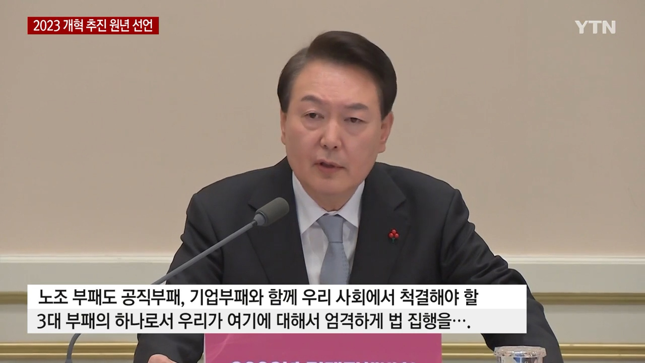 또 부정부패와 민생범죄로 인한 서민 피해 범죄에 대한 엄정 대응을 강조했고 노동개혁을 국정 최우선 과제로 내세웠습니다. 화물연대 파업 당시 업무개시명령이 발동되어 현장에 복귀했으며, 건설노조 집회 과정에서 집행된 강경 대응 등 일련의 조치들이 이어졌습니다. 노사관계에서 분쟁을 줄이기 위해 정부가 강조한 건 노사 법치주의입니다.
