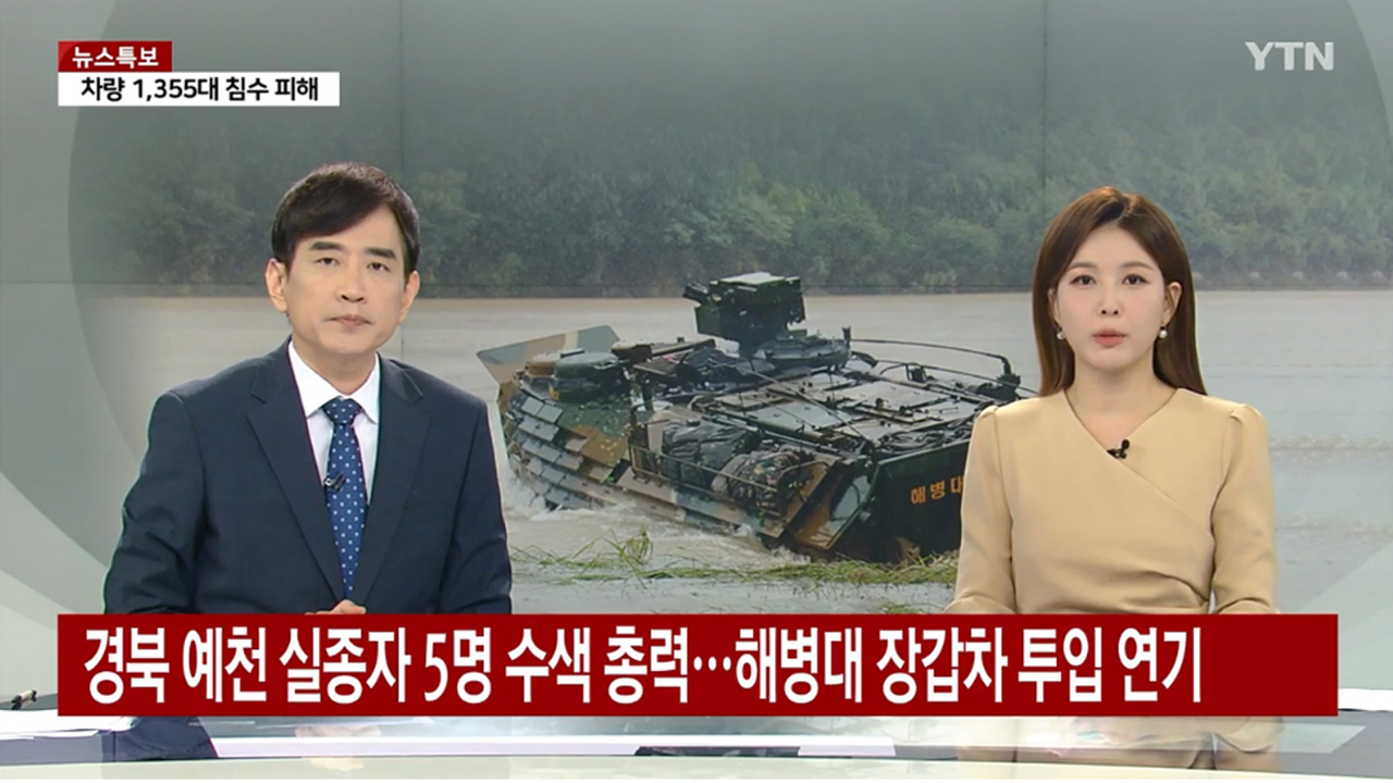 마찬가지로 경북 예천군에서도 폭우로 심한 피해를 입고 실종자까지 나왔습니다. 이에 경찰과 소방은 물론 해병대까지 투입해 실종자 수색에 나섰습니다. 해병대는 하천에 수륙양용장갑차까지 투입해 실종자 수색에 나섰지만 빠른 물살 탓에 강물로 투입된 장갑차도 5분 만에 철수했습니다.